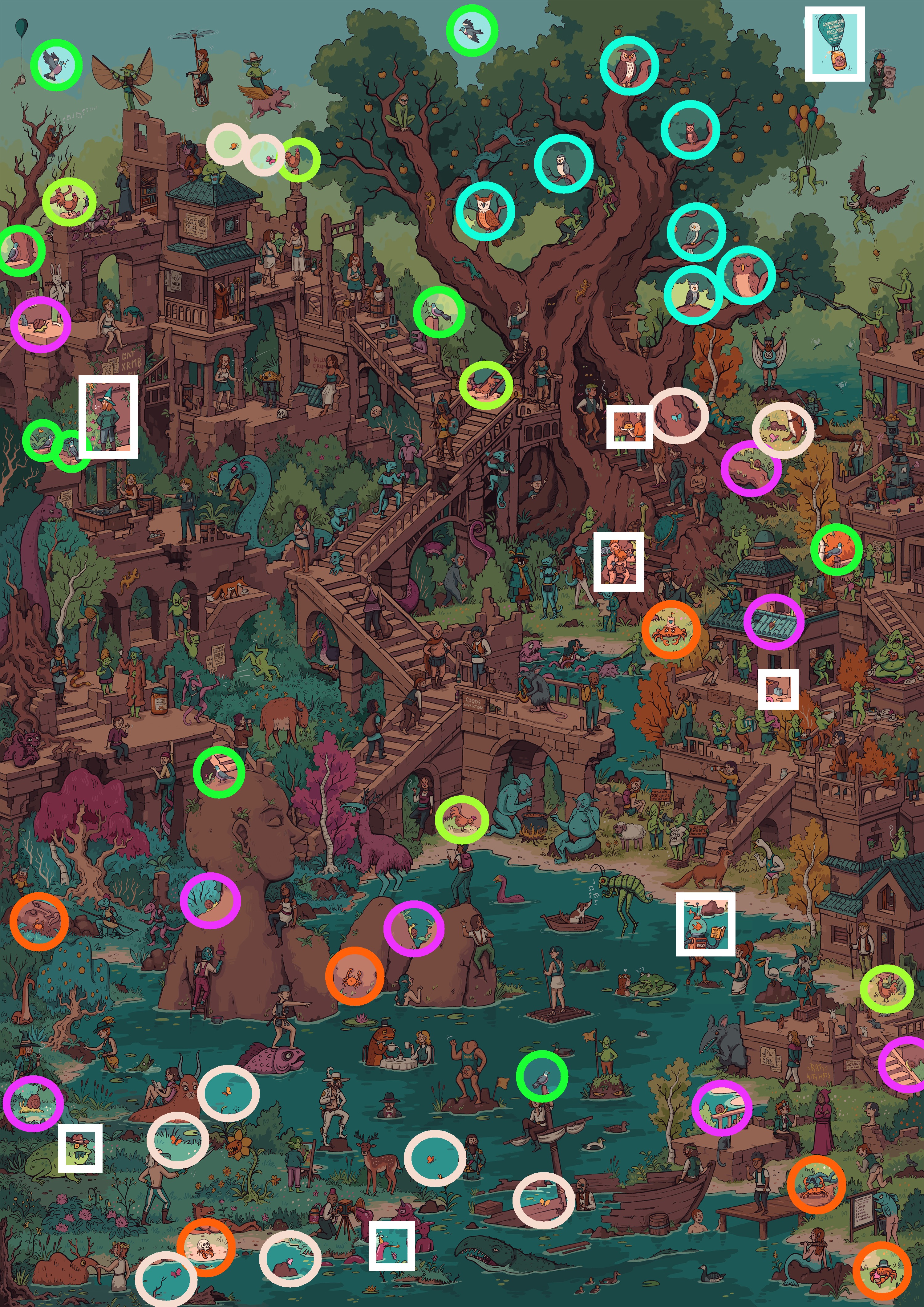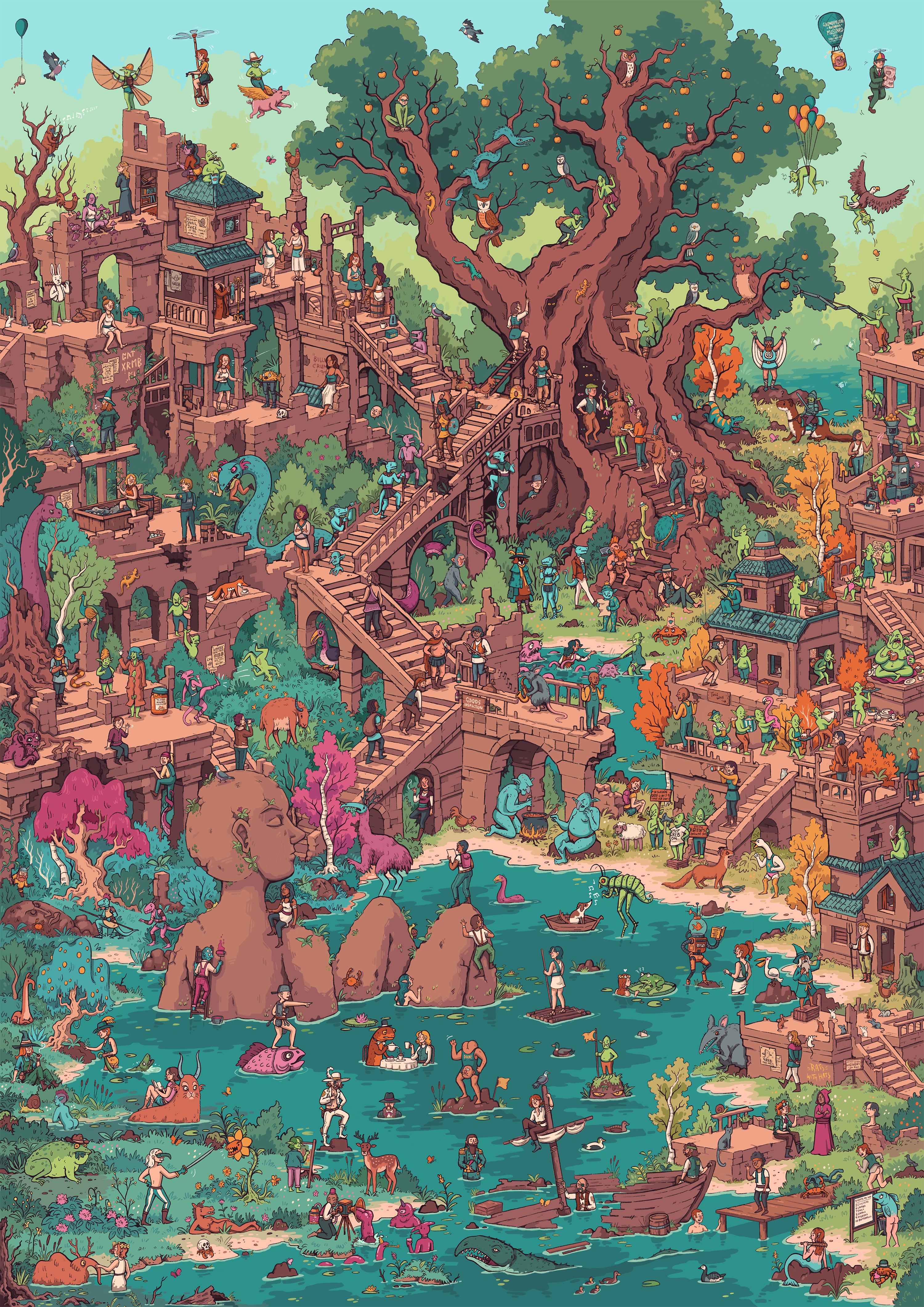 Se trata de una imagen enorme para buscar todo tipo de cosas (como un "¿Dónde está Wally?" de estética fantástica). Lo que hay que buscar, oficialmente, es el siguiente listado de animales: