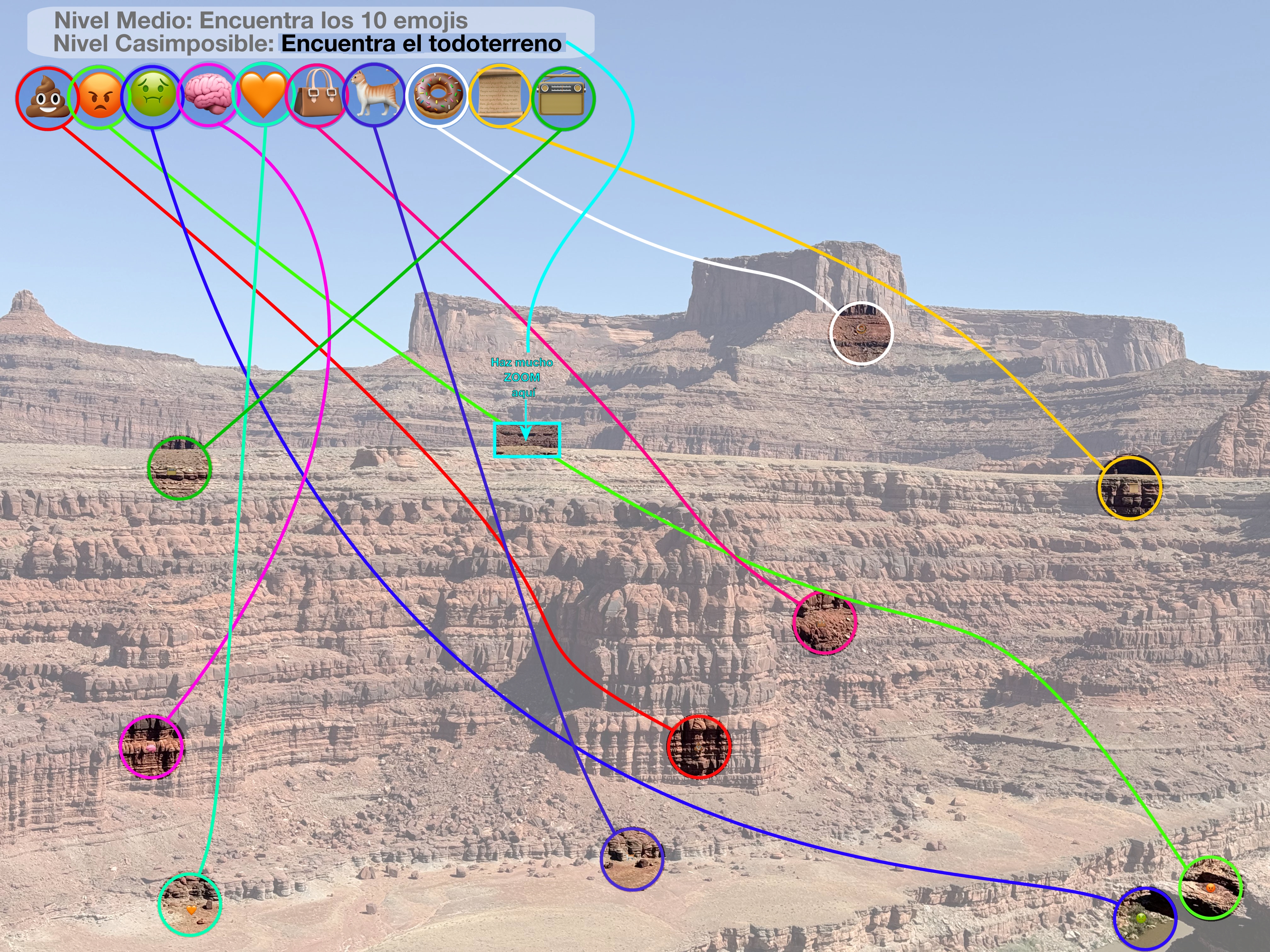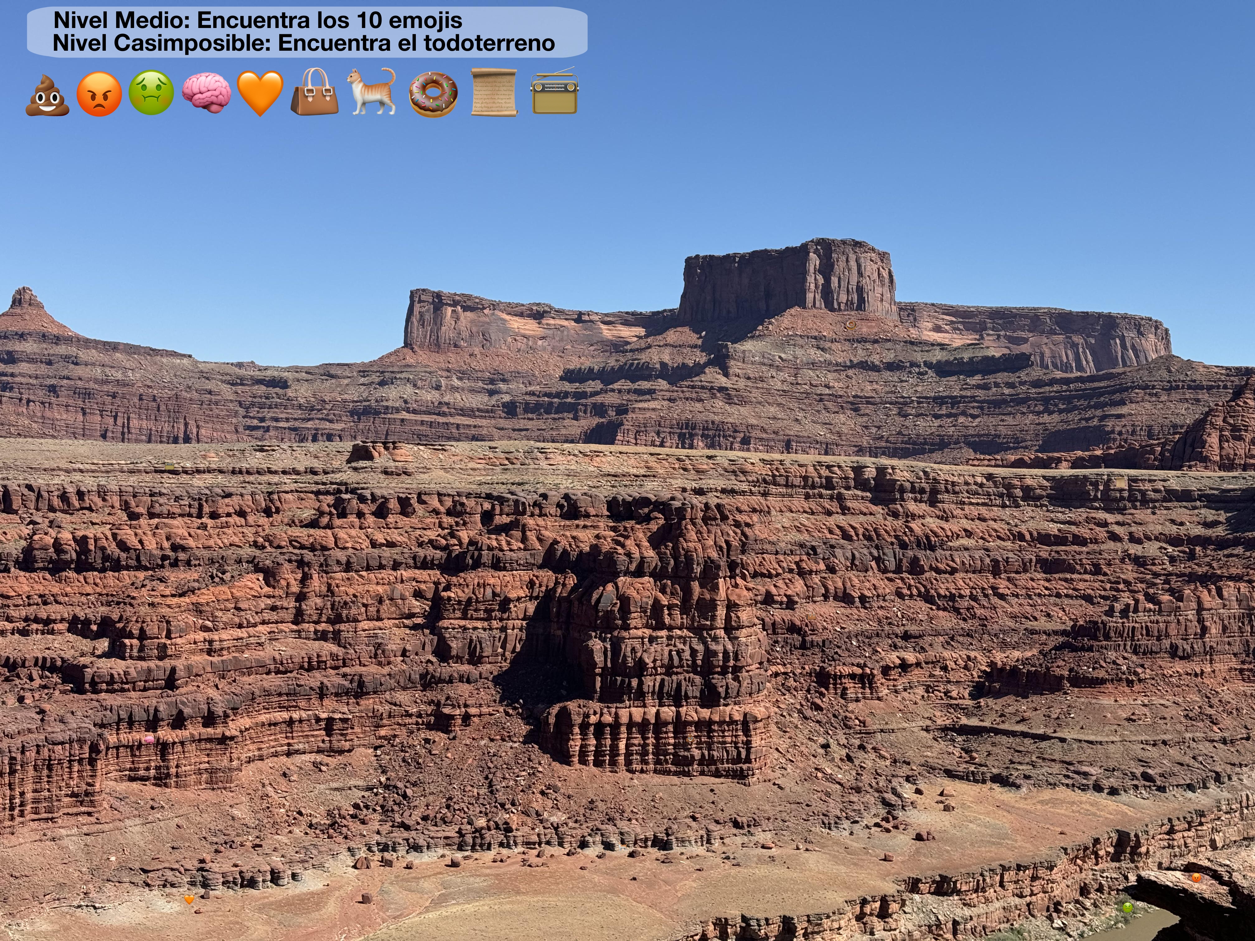 Nota: El juego tiene 2 niveles. En el primer nivel (sencillo o medio) hay que encontrar los 10 emojis. Pero hay un segundo nivel de nivel super-muy-ultra-difícil: encontrar un todoterreno. Es casi imposible, así que os dejo una pista: se trata de un coche que está en la foto. No es un emoji ni un dibujo. Es parte de la foto
